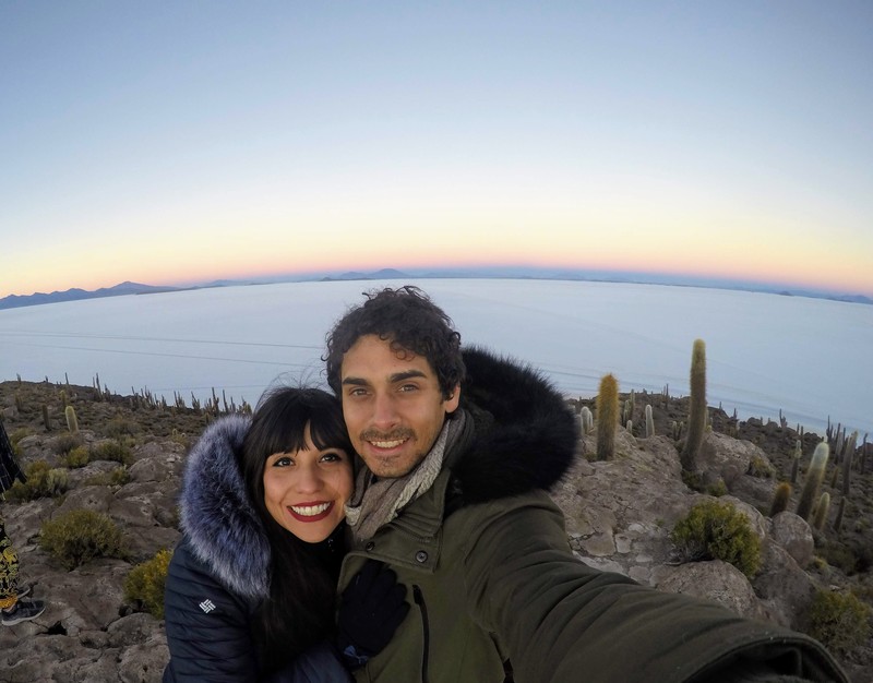 Sunrise at Valle de Cactus in Uyuni Salt Flats! (this is salt, not snow behind us!!)